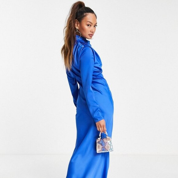 Asos Dresses Asos Design High Neck Drape Satin Bias Cut Maxi Dress In Blue In Size 2 Poshmark